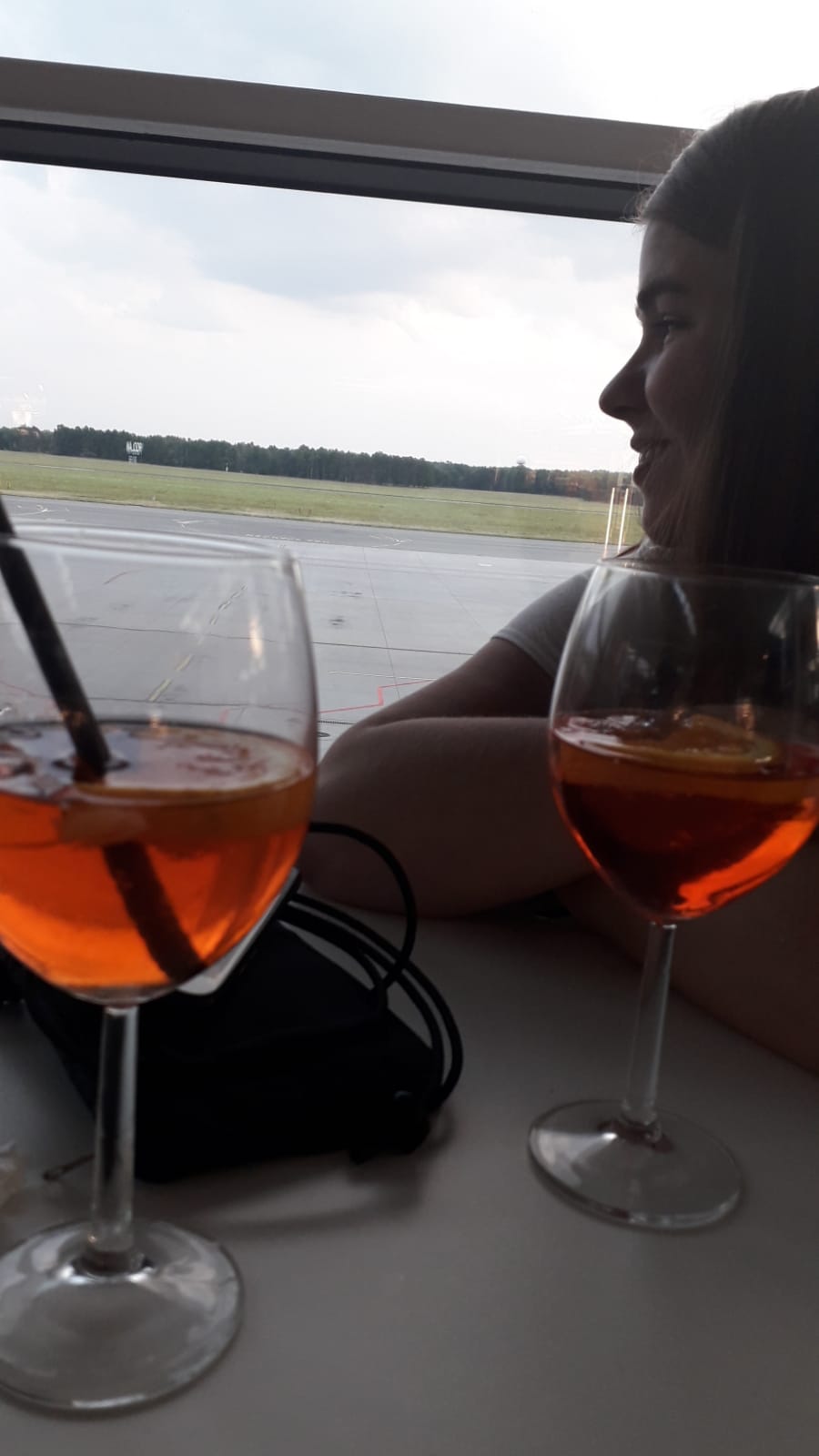 Naštěstí to dost odsýpalo a na první pohled obrovská fronta nám mizela před očima. Chudák chlapec před námi, který asi letěl poprvé a nevěděl, že velký kufr si na security vzít nemůže a musí první k odbavení. Tak si tu frontu holt dal dvakrát, příště bude vědět. Průchod kontrolou byla taky rychlovka, očividně stačí nebrat nože a tvarůžky a nikdo tě z terorismu nepodezřívá.. Nic už tedy nebrání tomu jít ke gatu (7), dát si za odměnu něco dobrého s letištní přirážkou a počkat hodinu a půl na odlet. Kolem půl 8 jsme tedy našly náš gate, gate bar i záchody, vše OK. Na obrazovce se tedy objevilo lehce znepokojující DELAYED - INFO 20:00, ale řekly jsme si, že těch 10 - 15 minut navíc přežijem. Daly jsme si aperol a čekaly na info.