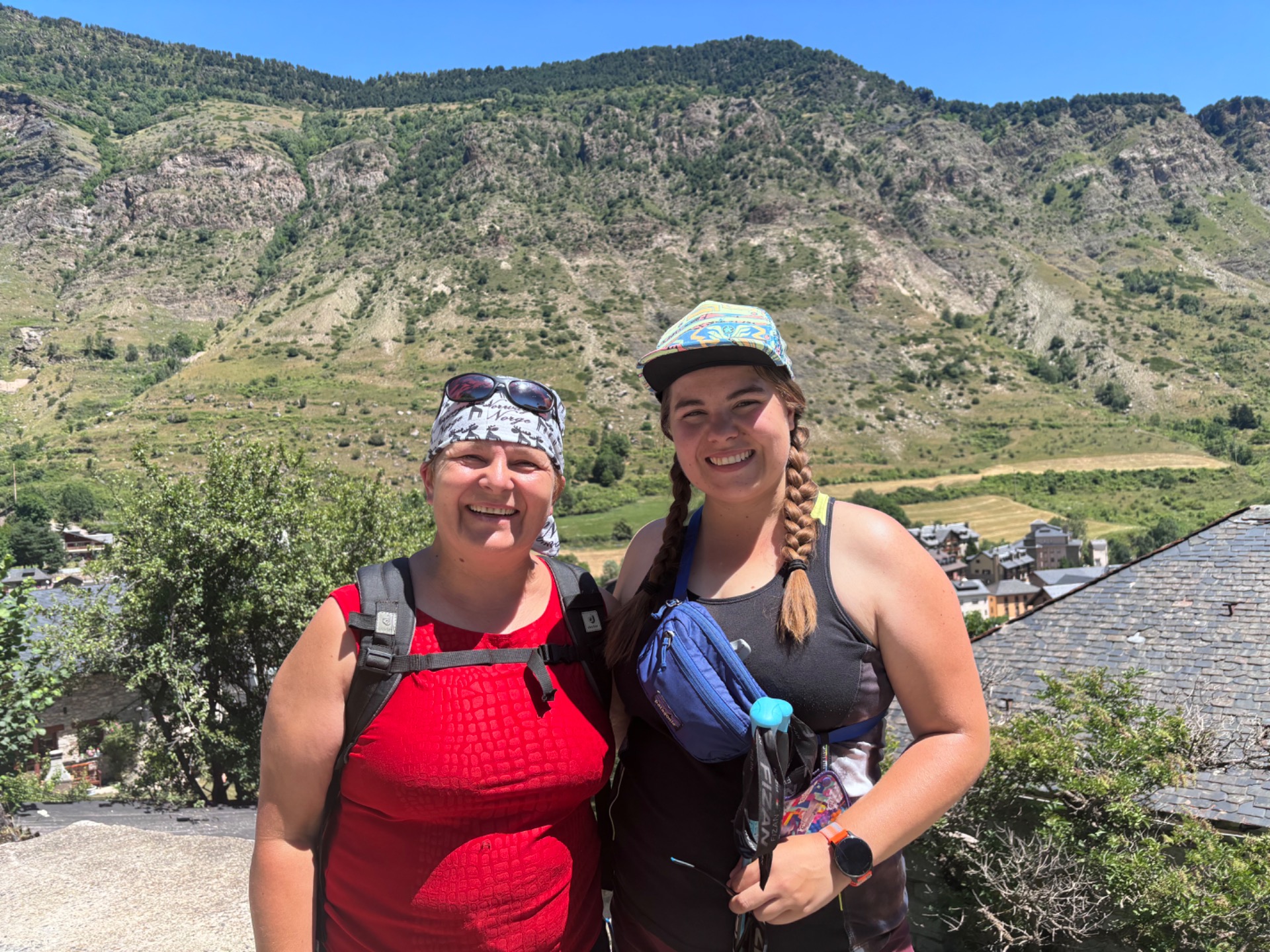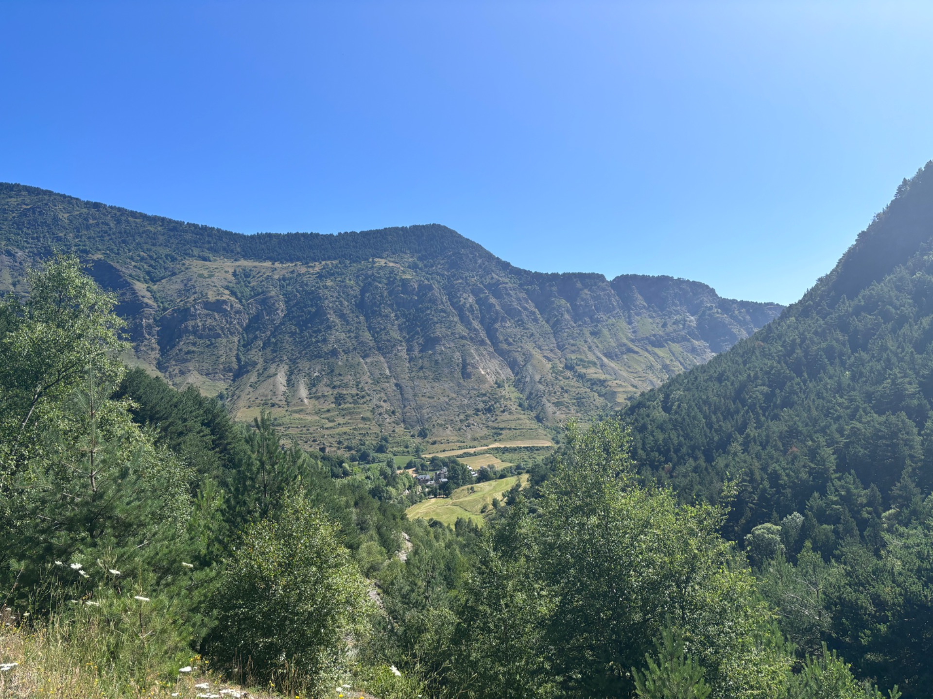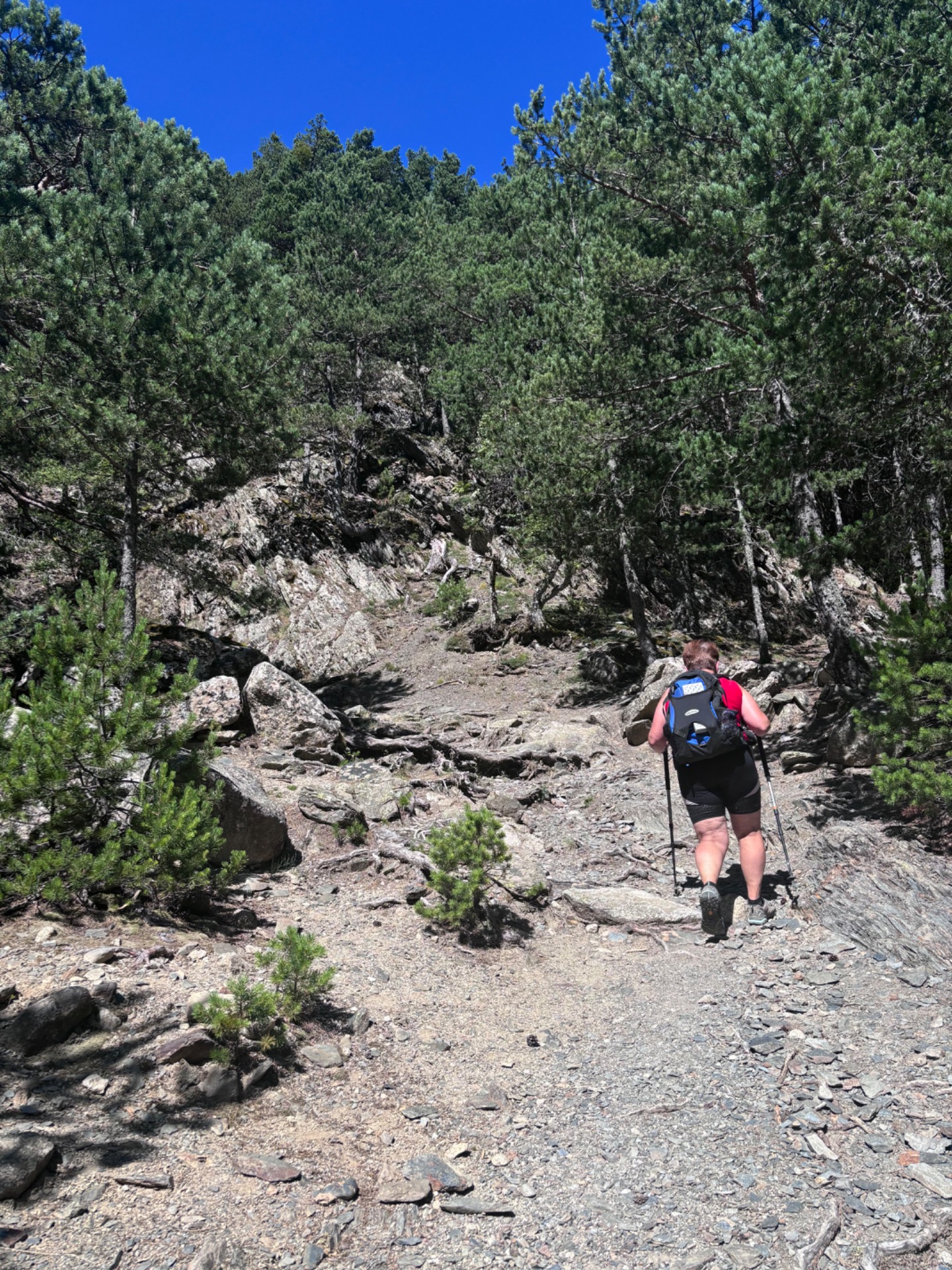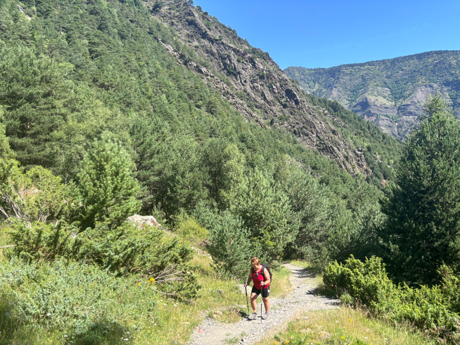 Já vám nevím, ale čekali byste, že když jedete na dovolenou do Pyrenejí, tak furt budete jak mačo šlapat do kopce? Já teda ne.. ale sekla jsem se. Furt prostě nahoru a nahoru a ještě víc nahoru. Oukej, to by i šlo. Ale ono je furt tak strašně horko.. 🫠 cítím jak mi jedna kapka potu za druhou stéká po zádech až mezi.. no, myslím že všichni víte, co navazuje pod zády. Do toho se mi potí obočí a brečím, vyjímečně ne pro tu krásu kolem. Žádnou totiž nevidím. Dnešní tůra měla vést kolem řeky a vodopádů a ta řeka si teče někde úplně v řiti v lese daleko pod náma. Naštěstí za chvilku vcházíme aspoň mezi stromy, tak je to trošku lepší. Míjíme ale rodinku, tatínka se psem a maminku se dvěma synáčky, kteří sem byli očividně vytaženi proti své vůli a nedají to rodičům jen tak zadarmo. Cukají se a vztekají ale pomalu se sunou směrem vzhůru.