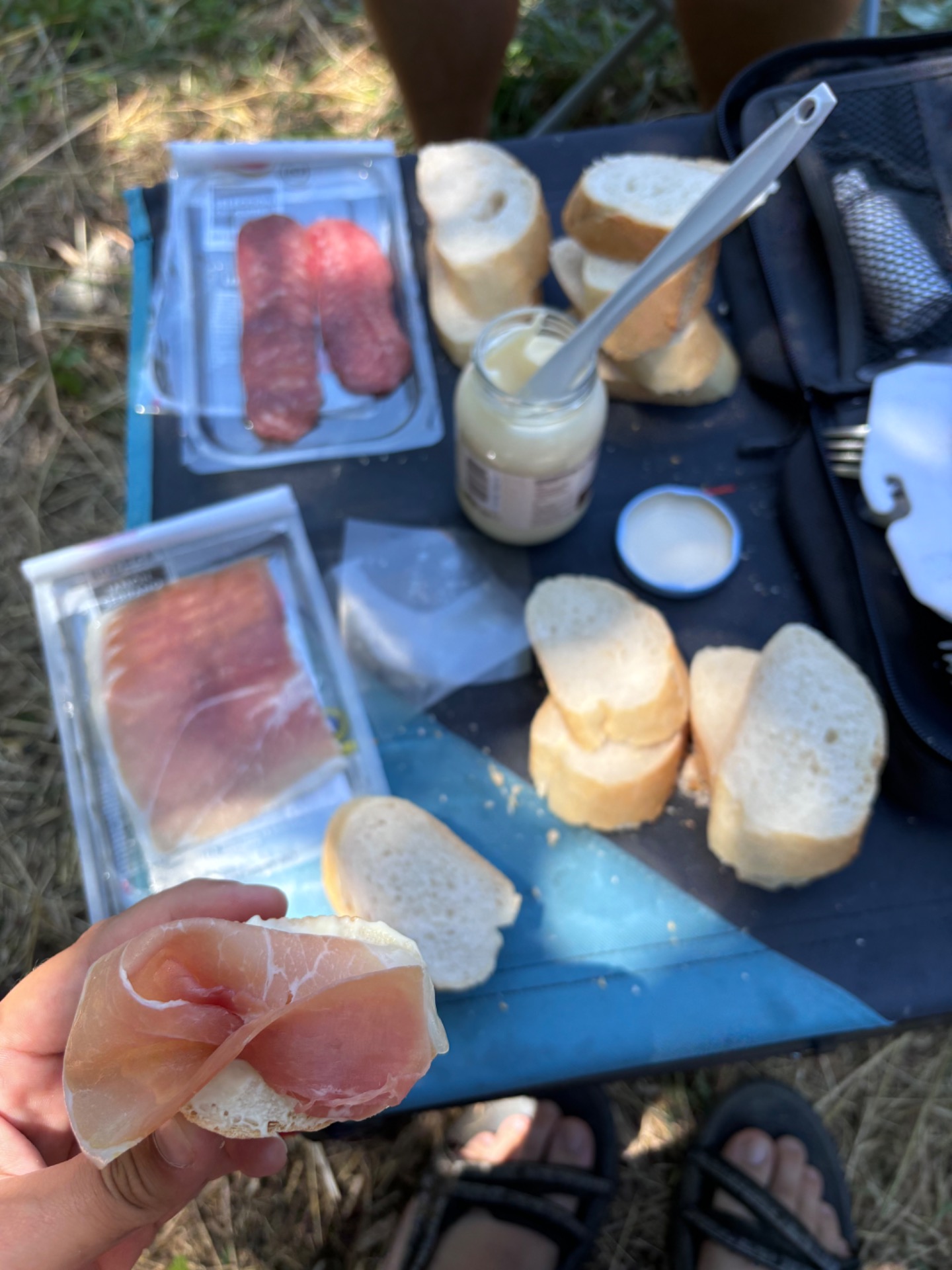 Začíná to nevinnou koupačkou jen od kotníků dolů, ale jen co dojíme poslední kousek melounu, shazuji svršky a čvachtám se v potoce celá. Vylezu k autu pro oblečení a mamča mě střídá. Nahazujeme šaty a užíváme si ten pocit "nového člověka". Pak si u auta nachystáme na oběd bagetu s jarmonem a salámem, rajčata a teplý ice tea, všechno to do sebe hodíme, nalodíme se a jedeme. A kam? No přece do další země ☺️