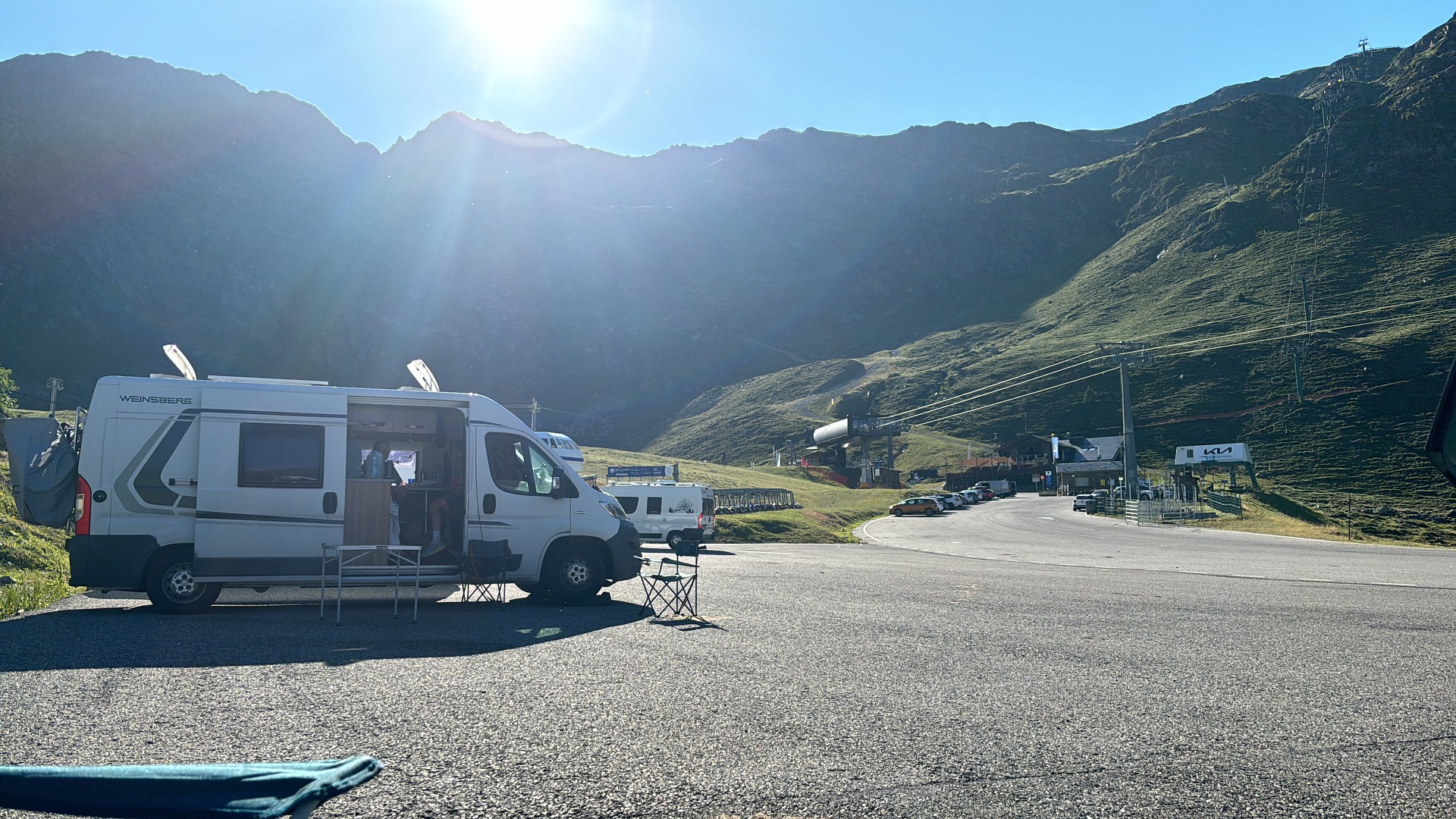 Mám najité parkoviště hned u našeho zítřejšího startu tůry, opět se jedná o lyžařské středisko, ale lanovka jezdící tady do hor stále funguje i v letní sezóně, tak tady mají omezený vjezd na toto nejvýše položené parkoviště. Od půl 9 ráno do půl 6 večer máš smůlu a jeď nahoru lanovkou. Od večera do rána je ale závora otevřená a můžeš nahoru jet, zaparkovat a existovat. Přijíždíme sem chvíli po 18hod, takže by to mělo být ok. Průjezd tam teda nevidíme a už to skoro chceme otočit, že pojedeme hledat místo jinam ale naštěstí za námi přijede druhé auto, které to tady zná a na jistotu projede kolem zábran až ke zvednuté závoře, které jsme si předtím nevšimly. Vyjíždíme tedy nahoru a parkujeme na velikém parkovišti ve 2220 m.n.m.