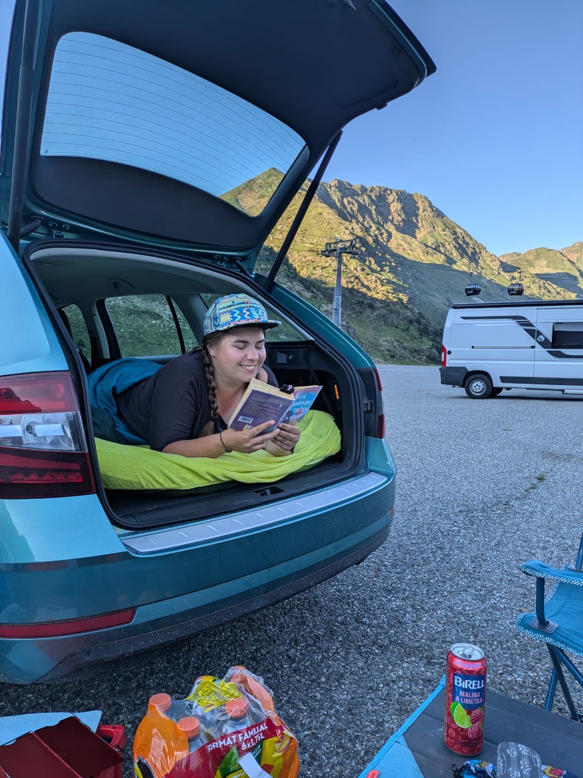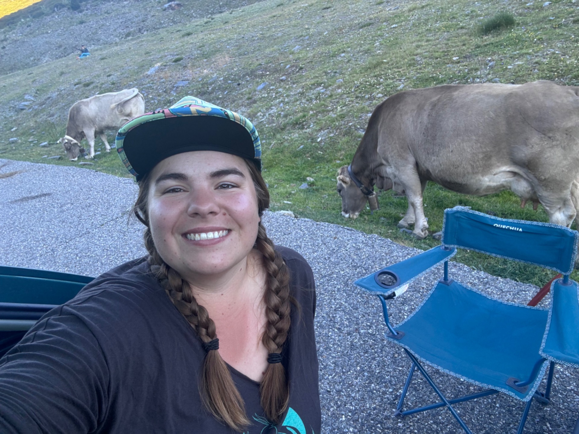 Je brzo, takže si v klidu otevíráme cider/birrel a knížku a vegetíme u auta. Po nějaké době se pustíme do přípravy večeře, dneska máme bramborovou kaši s cibulkou a slaninou, co jsme si koupily u té slečny v Espotu. Vedle nás dva chlapi s obytňákem a nádherným pejskem grilují a voní to tu parádně. Všichni se najíme, každý toho, co má. Ale čas večeře očividně ještě neskončil, protože za chvilku ze svahu přichází asi 6 krav, které se rozhodnou pást zrovna kolem našeho auta.😀