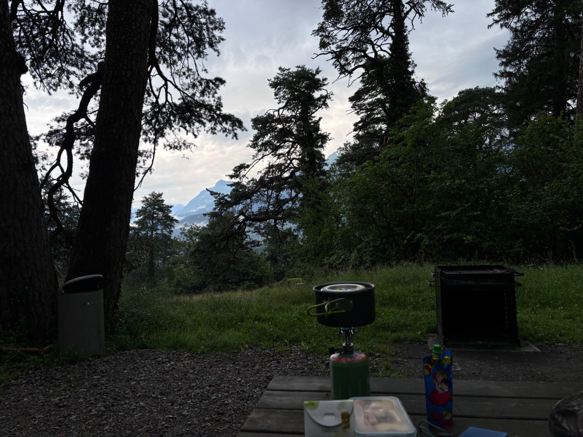 V klidu lesa usteleme naše lože, spustíme transformaci a rázem před námi stojí plně vybavená kuchyň. Mamka si chce ještě před snídaní odskočit a už je tady boží trest za to, že nebyla na parkovišti - řízla sebou v lese na zem. Naštěstí nic hrozného, jen po ní v Lichtenštejnsku zůstal otisk zadku. Pozitivní dopad tohoto ..ehm.. dopadu je to, že kousek pod svou přistávací plochou objevila pramen pitné vody, lavičku a stůl. To vše s krásným výhledem. Přesouváme se tedy spolu s vařičem a bábovkou sem a užíváme si pohodovou snídani na čerstvém vzduchu.