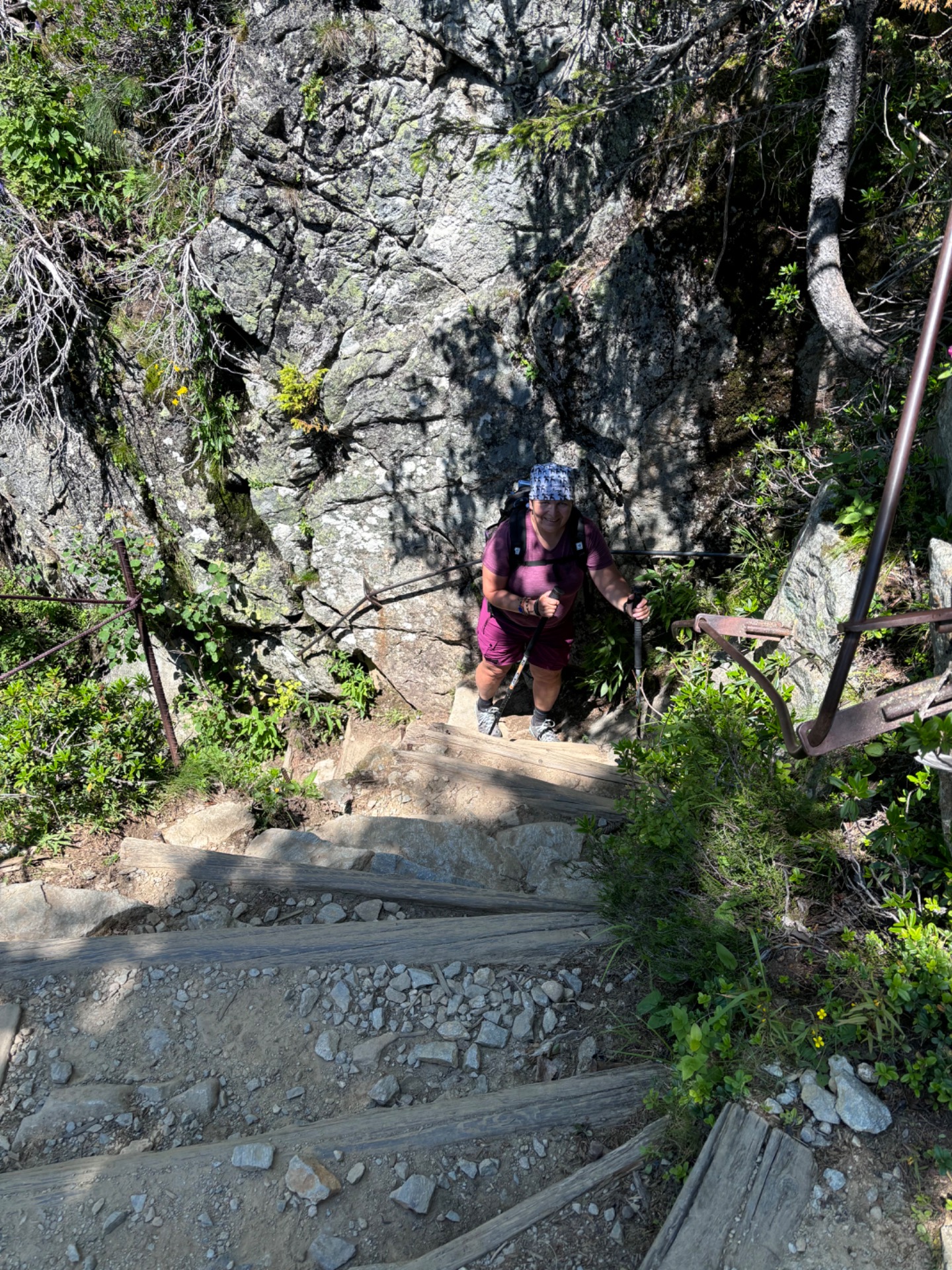 Vyjedeme kabinkou nahoru a už se kocháme. Ty výhledy jsou prostě božské. Nacházíme se poblíž startovačky, tak chvíli sledujeme padáčkáře, jak s naprostou lehkostí startují ze svahu a letí proti Mont Blancu. Zase jiná podoba svobody. Fotíme si selfíčko, posíláme pozdrav našemu dvornímu pilotovi Křísťovi 🪂 a vyrážíme vpřed. Terén je o poznání jiný, než včera. Lesní cestu vystřídalo kamení, místo stromů kosovka, místo potůčků suťoviska, výhledy stále spektakulární, ale zase trochu jinak. Jdeme vlastně stejnou trasu jako včera, jen v opačném směru a o cca 1000 metrů výš. Název balkon má stezka oprávněně, v některých místech se opravdu jedná o úzký chodníček vystrčený ze svahu, pod i nad ním je sráz, kolem roste luční kvítí a ze všech stran se ozývá bonne journée!