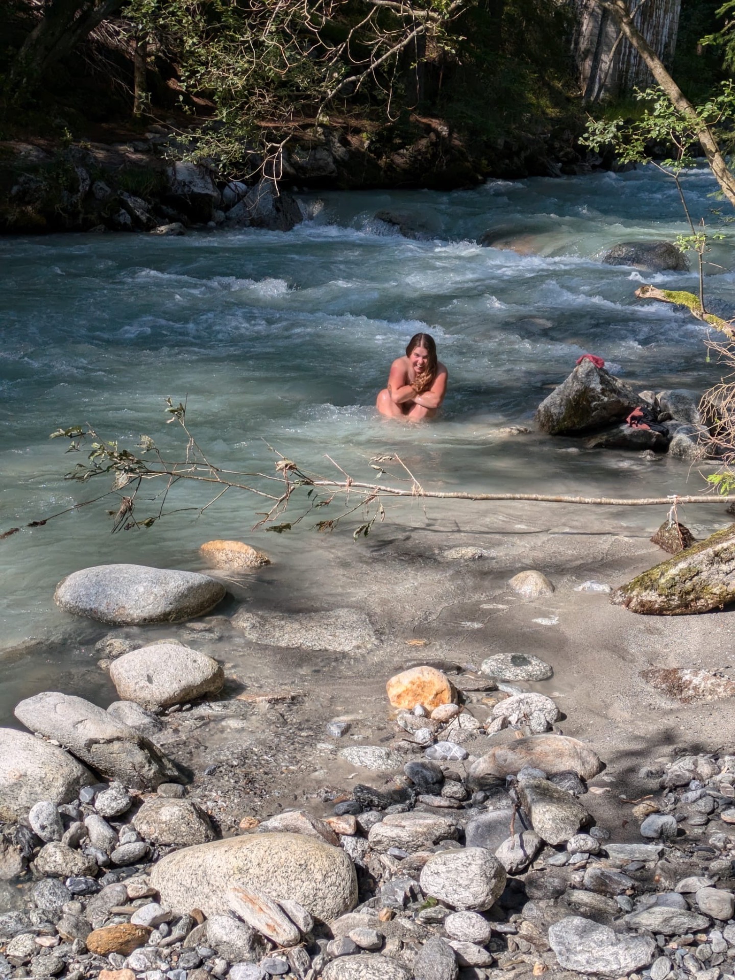 Ještě chvilku bloudíme po okolí ale nakonec zdárně docházíme k autu. Ještě že jsme ho zaparkovaly pod tou střechou. Je tady příjemný chládek a hned se zavlažujeme studenou poděbradkou. Mamča usedá za volant, abych mohla po cestě psát a hledat místo na spaní a vyrážíme. Ještě se ale zastavíme u naší oblíbené řeky, abychom se před cestou osvěžily. Po dnešní procházce jsme totiž vypečené hezky dočervena a je třeba studenou “sprchu”. Oproti prvnímu dni voda dost klesla, ale i přesto se nám daří najít tůňku, ve které se umyjem a vyrážíme.