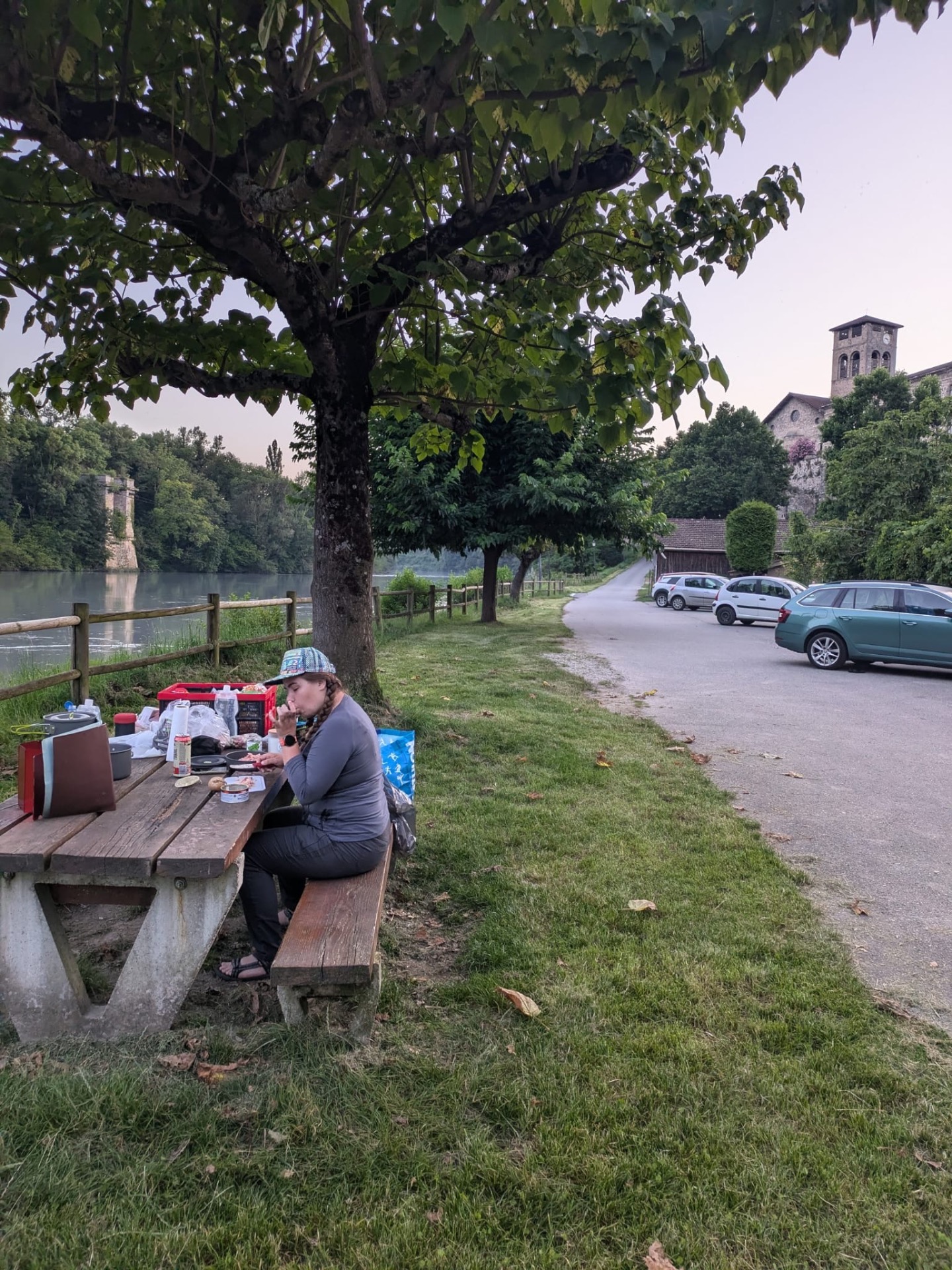 Kolem osmé večer už začínáme přemýšlet nad spánkem tak startuji Park4night a hledám místo na zakempení. Podařilo se celkem brzo - super malé parkoviště u řeky s piknikovým posezením a asi 5 minut chůze od veřejných WC. Vše co potřebujeme tady je, takže berem. Dojedeme, zaparkujem a hned se pouštíme do vaření. Kolem vody vede hezká stezka, na které se občas protáhne nějaký pejskař nebo běžec, případně skupinka puberťáků s flaškou vodky, která nejspíš chtěla zakempit tam, kde my. Sorry, obsazeno.