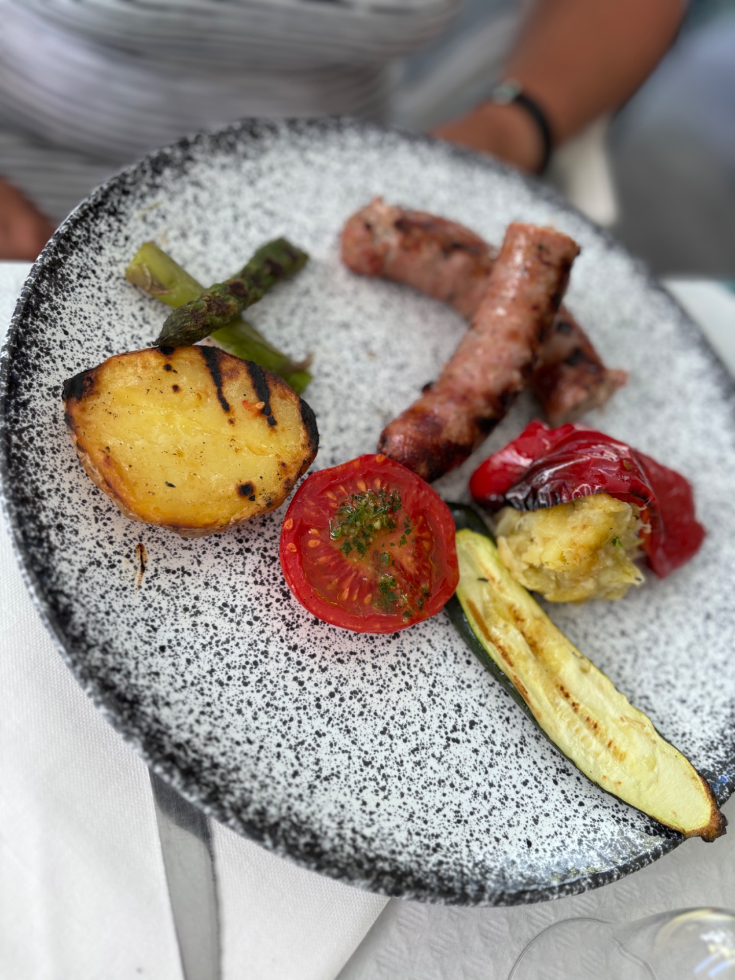 Docházíme na zahrádku restaurace a bereme stůl ve stínu. Těšila jsem se na paellu nebo nějakou jinou mořskou potvoru, ale bohužel tady kromě uzeného lososa nic ze slané vody není. Nevadí, objednáváme si místní specialitky - katalánskou polévku, katalánskou klobásku pro maminku a telecí steak pro Terezku. Na pití fantu a jsme spoko. Dokonce jsme dostaly i tapas - naprosto luxusní olivy a bagetku. Brzo potom přichází i zbytek oběda a svět je velmi v pořádku. Všechno je to vynikající. Po dojezení přichází opět útlum, ale tentokrát se nedáme. Z posledních sil se vykutálíme na parkoviště a do auta, abychom přejely kousek za Espot na parkoviště na kraji národního parku.