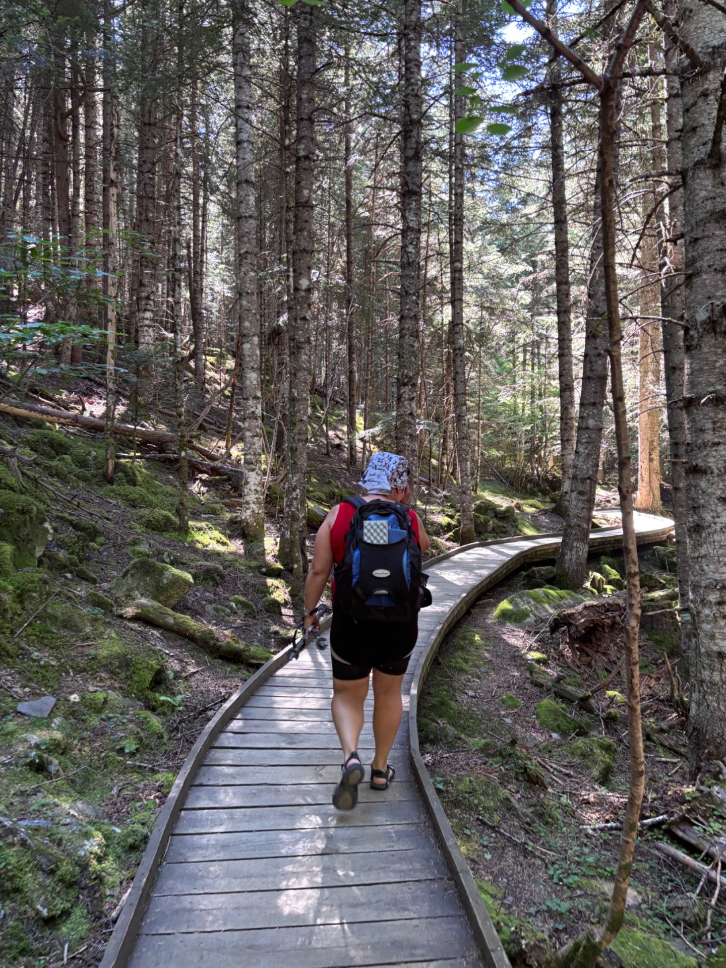 Paní z informací nám dává mapku okolí a směřuje nás na parkoviště. Tady nahazujeme letní outfity a jdeme totálně nalehko nahoru k jezeru. Na nohy sandály, nejtenčí kraťasy, tričko a jeden batoh s dvěma litry vody. Mobil na focení a to stačí. Ze silnice se během chvilky dostáváme do krásného lesa, kde je chodník vytvořen ze dřeva, asi aby se zabránilo sesuvu hlíny. Za chvíli přicházíme k hezkému dřevěnému mostku, přes který se dostáváme k prudšímu stoupání. Dřevěný chodník končí a je tady místo něj částečně hliněná, částečně kamenitá cesta. Stále krásné. Otevírají se nám výhledy na okolní kopce, kolem nás teče potok, zelená se tráva a stromy, nádhera. Většina lidí jde proti nám, přecejen už je kolem páté odpoledne a je čas spíš na konec výletu než jeho začátek. Jeden pán nám asi i něco v tom stylu říká, spustí na nás něco španělsky a u toho si klepe na zápěstí v místech, kde jiní lidi mají hodinky. Tak asi nás kárá že nestihneme večeři. Neva, my jsme tak naprané, že nemám pocit, že bych v příštích 24 hodinách něco jedla.