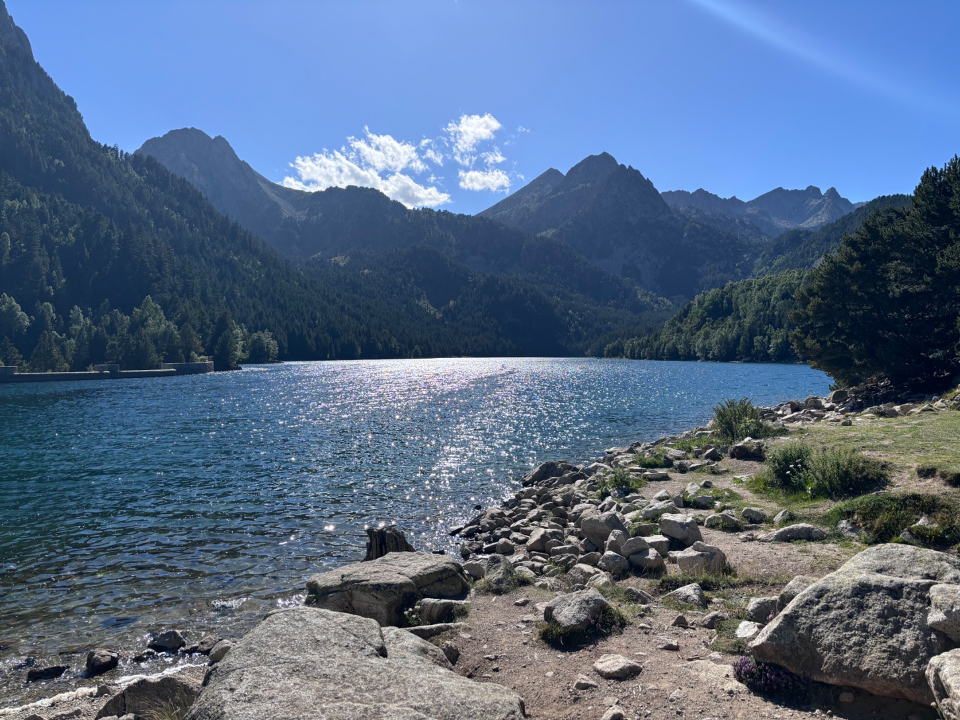Šlapeme krásným prostředím, fotíme, pijeme z potoka.. někomu už by to mohlo připadat jako nuda. Ale nám ani náhodou, máme na obličeji takový přiblblý úsměv a nic nám nechybí. Stoupámé vzhůru a asi po hodině a čtvrt docházíme k nádhernému jezeru Estany de Sant Maurici.