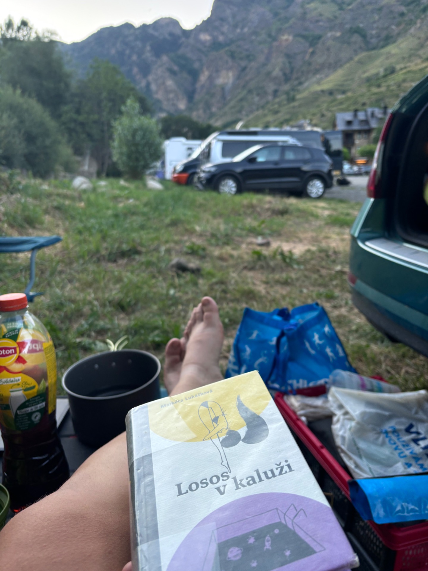 Na vycházce nám hezky vytrávilo, ale zatím večeřet nebudeme. Taháme si každá svou knížku, pivko/birella a zahajujeme čtenářský klubík. Kolem půl desáté vaříme kuskus s tuňákem k večeři, k tomu černý čaj s mlíkem a medem, taková naše klasika. Já ještě za svitu svíčky dočtu dojemného Lososa v kaluži a asi ani nemusím začínat dneska novou knížku. Nechám to doznít, sním si večeři, dopiju čaj a jdeme si lehnout. Na zítra jsme si vymyslely ještě jednu procházku kolem vody ke dvěma vodopádům a pak se budeme přesouvat do Andorry, což znamená, že se naše cesta pomalu chýlí ke konci. Po procházce kolem andorrských jezer zahajujeme přesun domů. Samozřejmě ještě se zastávkami na gastrozážitky a koupačky, ale o tom zase další dny. Však do neděle ještě času dost. 🙂